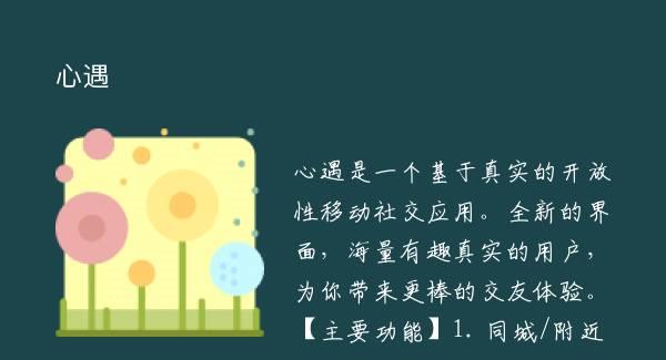 心遇是一个基于真实的开放性移动社交应用。全新的界面,海量有趣真实的用户,为你带来更棒的交友体验。【主要功能】1. 同城/附近的人:快速发现同城/附近用户,智能推荐助你找到有缘人
