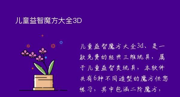 儿童益智魔方大全3d、是一款免费的经典三维玩具,属于儿童益智类玩具,本软件共有6种不同造型的魔方供您练习,其中包涵二阶魔方,经典的三阶魔方,四阶魔方,金字塔魔方,五魔方,经典异