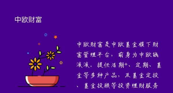 中欧财富是中欧基金旗下财富管理平台,前身为中欧钱滚滚。提供活期+、定期、基金等多种产品,及基金定投、基金投顾等投资理财服务,国内首批基金投顾试点机构。精选易方达、富国、鹏华、国