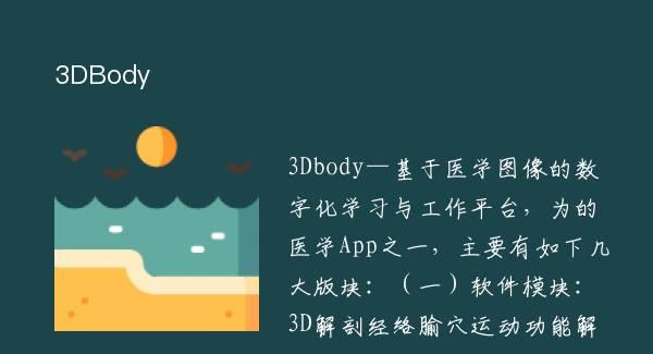 3Dbody—基于医学图像的数字化学习与工作平台,为的医学App之一,主要有如下几大版块:(一)软件模块:3D解剖经络腧穴运动功能解剖肌肉动作与解析动画精细解剖肌肉起止点骨性标