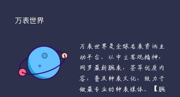 万表世界是全球名表资讯互动平台。以中立客观精神,网罗最新腕表,荟萃优质内容,普及钟表文化,致力于做最专业的钟表媒体。【腕表大全】 奢侈品牌:百达翡丽、江诗丹顿、积家、爱彼、宝珀