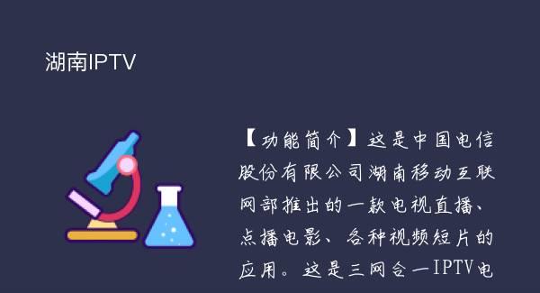 【功能简介】这是中国电信股份有限公司湖南移动互联网部推出的一款电视直播、点播电影、各种视频短片的应用。这是三网合一IPTV电视大屏的延伸工具,手机可以遥控电视,切换频道,湖南本