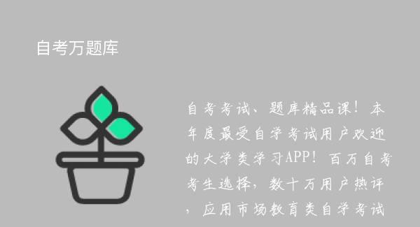 自考考试、题库精品课!本年度最受自学考试用户欢迎的大学类学习APP!百万自考考生选择,数十万用户热评,应用市场教育类自学考试排行榜前列!如果你想和他们一样不看书就能快速通过考试