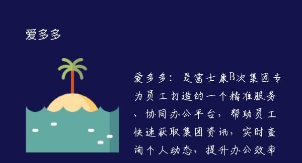 爱多多:是富士康B次集团专为员工打造的一个精准服务、协同办公平台,帮助员工快速获取集团资讯,实时查询个人动态,提升办公效率。五大模块,60余个功能点,为员工提供全方位最贴心的服