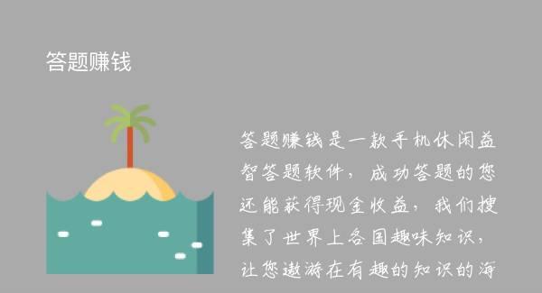 答题赚钱是一款手机休闲益智答题软件,成功答题的您还能获得现金收益,我们搜集了世界上各国趣味知识,让您遨游在有趣的知识的海洋中,从学科考试到职前教育,从明星到游戏动漫等百科题库应