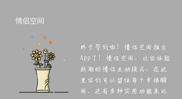 终于等到啦!情侣空间推出App了!情侣空间,让你体验新潮的情侣互动模式,在这里你们可以留住每个幸福瞬间。还有多种实用功能来记录你们的甜蜜日常!更有多款好玩有爱的情侣游戏等你来玩
