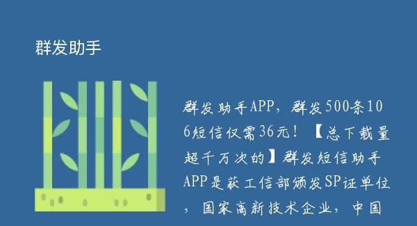 群发助手APP,群发500条106短信仅需36元!【总下载量超千万次的】群发短信助手APP是获工信部颁发SP证单位,国家高新技术企业,中国广告协会会员单位“红枫叶传媒”旗下的一