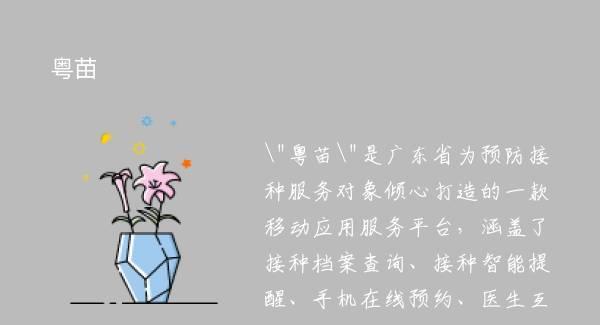 "粤苗"是广东省为预防接种服务对象倾心打造的一款移动应用服务平台,涵盖了接种档案查询、接种智能提醒、手机在线预约、医生互动、家长交流、疫苗百科、儿童保健等多项内容,使儿童预防接