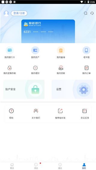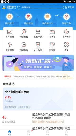 3、进入首页,这里有多种功能供用户进行使用,还可以查看自己的资产和银行卡,还能够进行转账汇款等多种功能;