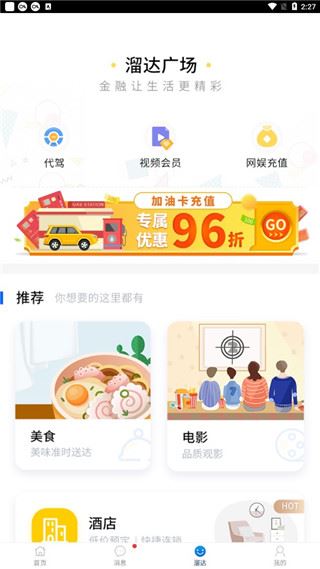 4、进入溜达广场,这里可以看到附近的美食和酒店等,帮助用户出行更方便,除此之外,软件中还有很多功能等着用户自行下载体验。