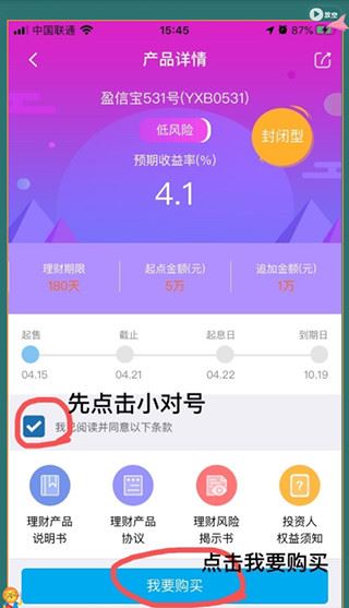 3、进入【盈信宝】页面,请详细阅读购买条款,核实无问题后,再进行勾选:我已阅读同意以下条款。