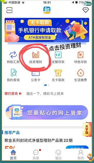 1、打开阜新银行手机银行app,点击app首页的【理财投资】