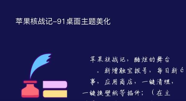 ?苹果核战记,酷炫的舞台。。新增触宝拨号,每日新鲜事,应用商店,一键清理,一键换壁纸等插件;(在主屏幕往上滑动可调出桌面快捷菜单,切换到【更多】界面,点击【版本更新】来更新到最