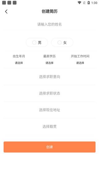 4、登录以后第一件事就是创建简历,填好自己的详细信息、求职意向等点击创建;