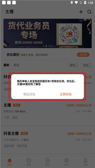 5、可以看到在创建完成后就正式进入了软件,如果你的简历还有可以优化的地方,会自动提醒您,点击稍后优化或者立即优化即可;