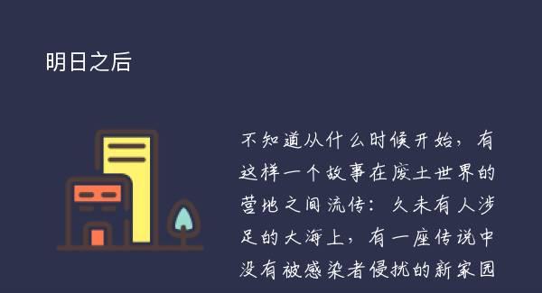 不知道从什么时候开始,有这样一个故事在废土世界的营地之间流传:久未有人涉足的大海上,有一座传说中没有被感染者侵扰的新家园消息如迷雾,难以捉摸又挥之不去。他们走出庇护所,搜寻新的