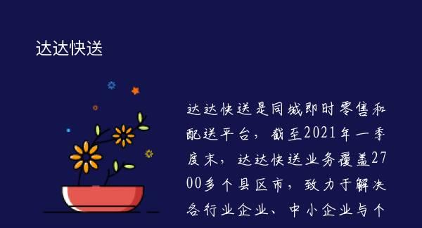 达达快送是同城即时零售和配送平台,截至2021年一季度末,达达快送业务覆盖2700多个县区市,致力于解决各行业企业、中小企业与个人用户丰富的同城配送需求。?【同城即时配送平台】