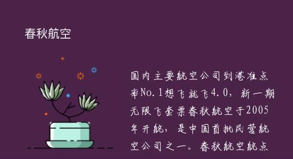 国内主要航空公司到港准点率No.1想飞就飞4.0,新一期无限飞套票春秋航空于2005年开航,是中国首批民营航空公司之一。春秋航空航点覆盖了中国的90%省市以及东南亚、东北亚的主