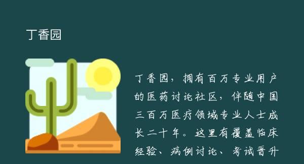 丁香园,拥有百万专业用户的医药讨论社区,伴随中国三百万医疗领域专业人士成长二十年。这里有覆盖临床经验、病例讨论、考试晋升、求职招聘、在线教育等权威、精华的内容。大众用户请移步「