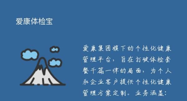 爱康集团旗下的个性化健康管理平台,旨在打破体检套餐千篇一律的局面,为个人和企业客户提供个性化健康管理方案定制。业务涵盖:体检、齿科、疫苗、基因检测的购买预约,报告查询和解读,以