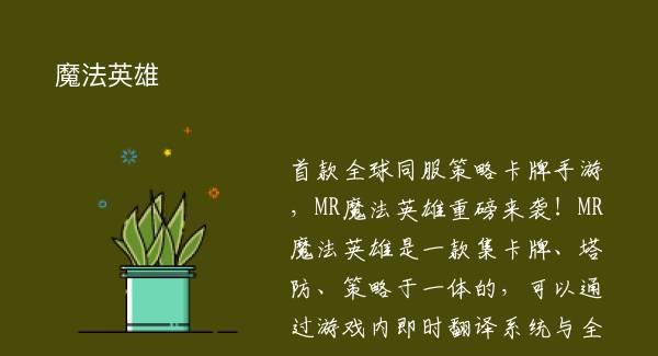 首款全球同服策略卡牌手游,MR魔法英雄重磅来袭!MR魔法英雄是一款集卡牌、塔防、策略于一体的,可以通过游戏内即时翻译系统与全世界玩家无障碍交流的卡牌手游。一次下载,多重体验,快