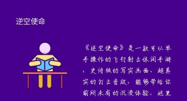 《逆空使命》是一款可以单手操作的飞行射击休闲手游,史诗级的写实画面、超真实的打击音效,能够带给你前所未有的沉浸体验。这里不仅有激情炫酷的战斗,更有趣味十足的探索玩法,还在等什么