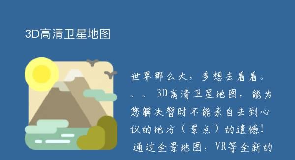 世界那么大,多想去看看。。。 3D高清卫星地图,能为您解决暂时不能亲自去到心仪的地方(景点)的遗憾! 通过全景地图,VR等全新的地图功能,现在您可以在手机上体验全新的3D高清卫