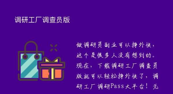 做调研员副业可以挣外快,这个是很多人没有想到的。现在,下载调研工厂调查员版就可以轻松挣外快了,调研工厂调研Pass大平台!无论你在何时何地,天涯海角接单挣外快,轻松操作有钱花,