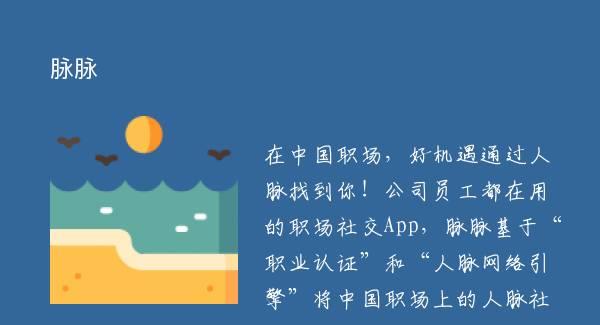 在中国职场,好机遇通过人脉找到你!公司员工都在用的职场社交App,脉脉基于“职业认证”和“人脉网络引擎”将中国职场上的人脉社交无限拓展到线上,真实高效的帮助职场人拓展人脉、交流