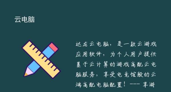 达龙云电脑,是一款云游戏应用软件,为个人用户提供基于云计算的游戏高配云电脑服务,享受电竞馆般的云端高配电脑配置!--- 享游戏特权限时体验!--- 手机变身口袋网咖,任何时间,