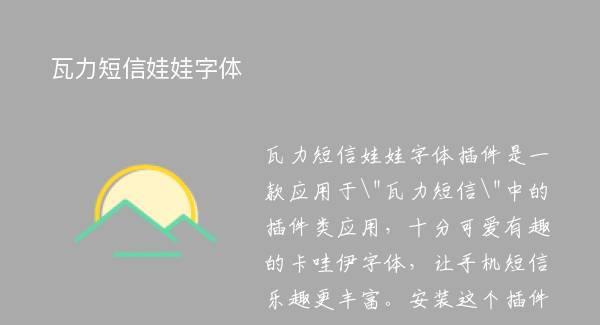 瓦力短信娃娃字体插件是一款应用于"瓦力短信"中的插件类应用,十分可爱有趣的卡哇伊字体,让手机短信乐趣更丰富。安装这个插件时,请确保您的手机已经安装了"瓦力短信"主程序,可通过谷