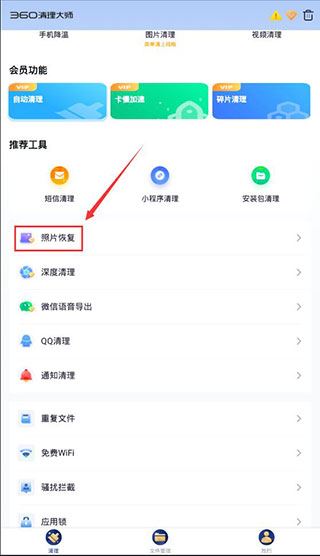 1、打开360清理大师的主界面,滑动至推荐工具的下方,你就可以看到照片恢复功能了。