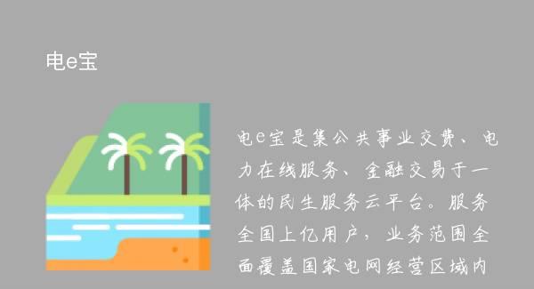 电e宝是集公共事业交费、电力在线服务、金融交易于一体的民生服务云平台。服务全国上亿用户,业务范围全面覆盖国家电网经营区域内26个省市和自治区(北京、天津、上海、重庆、河北、河南