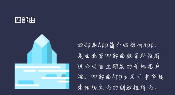 四部曲App简介四部曲App,是由北京四部曲教育科技有限公司自主研发的手机客户端。四部曲App立足于中华优秀传统文化的创造性转化,结合前沿科技,助推中小企业战略创新。【特色优势