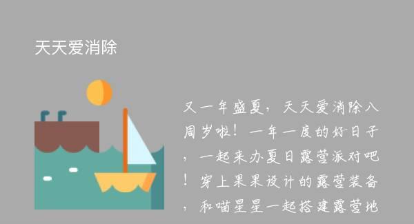 又一年盛夏,天天爱消除八周岁啦!一年一度的好日子,一起来办夏日露营派对吧!穿上果果设计的露营装备,和喵星星一起搭建露营地、吃琦琦熊做的美味野餐、和黄豆豆一起做游戏、还有篝火旁的
