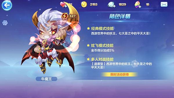 牛魔王的战力是527,炫飞模式技能是金币得分加成5%,是一个速度型角色。它的技能是发动技能变为火旋风瞬移一定距离,瞬移结束获得高分和能量,每隔一段时间飞出加上三个法宝,吃到能获得特殊能力,鸠摩炎是瞬移后冲锋,芭蕉扇是瞬移后冲刺,天罡玉是获得护盾。在超级奖励关卡,牛魔王能召唤元神,金币变为高分宝珠。法老黑豹的冲刺、冲锋加成和牛魔王的技能更很好的搭配。