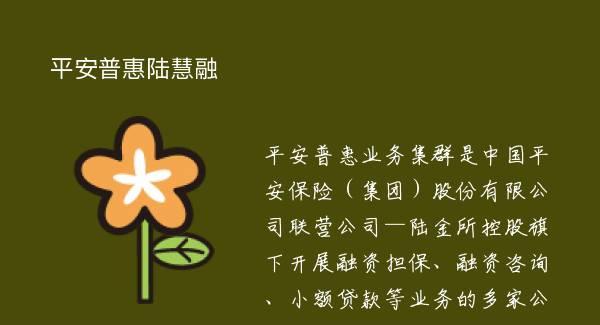 平安普惠业务集群是中国平安保险(集团)股份有限公司联营公司—陆金所控股旗下开展融资担保、融资咨询、小额贷款等业务的多家公司的总称,平安普惠陆慧融是平安普惠业务集群的品牌焕新名称