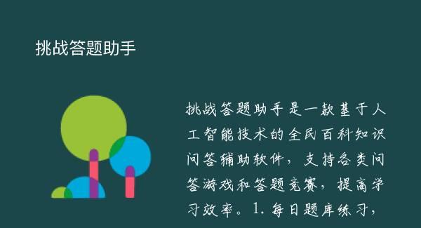 挑战答题助手是一款基于人工智能技术的全民百科知识问答辅助软件,支持各类问答游戏和答题竞赛,提高学习效率。1.每日题库练习,帮助提升学习效率。2.支持多种答题方式和玩法,使用简单