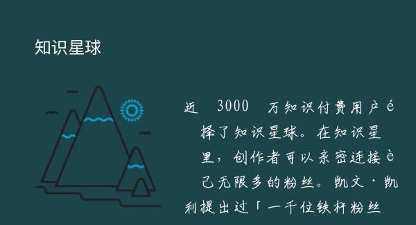 近?3000?万知识付费用户选择了知识星球。在知识星球里,创作者可以亲密连接自己无限多的粉丝。凯文·凯利提出过「一千位铁杆粉丝」的观点:任何从事创作或艺术的人,只要能获得一千位