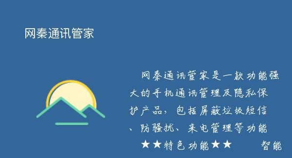 网秦通讯管家是一款功能强大的手机通讯管理及隐私保护产品,包括屏蔽垃圾短信、防骚扰、来电管理等功能 ★★特色功能★★ ? 智能短信过滤,语义特征分析功能 不需设置任何关键字或者