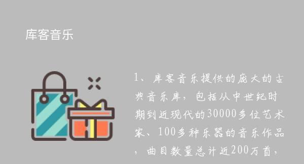 1、库客音乐提供的庞大的古典音乐库,包括从中世纪时期到近现代的30000多位艺术家、100多种乐器的音乐作品,曲目数量总计近200万首,内容涵盖欧洲各音乐时期音乐作品、各类不同