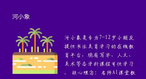 河小象是专为7-12岁小朋友提供书法美育学习的在线教育平台,现有写字、人文、美术等各学科课程可供学习。 核心理念:名师AI课堂教学+专业老师作业点评 通过丰富的交互和科学的教学
