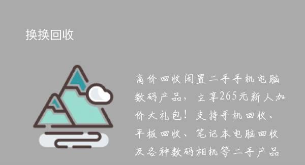 高价回收闲置二手手机电脑数码产品,立享265元新人加价大礼包!支持手机回收、平板回收、笔记本电脑回收及各种数码相机等二手产品回收为用户提供高价、放心、快速的二手手机电脑回收优质