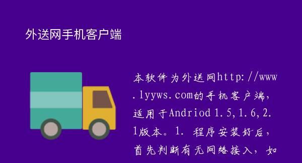 本软件为外送网http://www.lyyws.com的手机客户端,适用于Andriod 1.5,1.6,2.1版本。1.程序安装好后,首先判断有无网络接入,如果没有,提示您跳