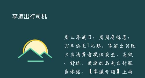 周三享道日,周周有惊喜,打车低至1元起。享道出行致力为消费者提供安全、高效、舒适、便捷的品质出行服务体验。【享道介绍】上海、郑州、苏州已开通运营服务。享道出行整合上汽集团全产业