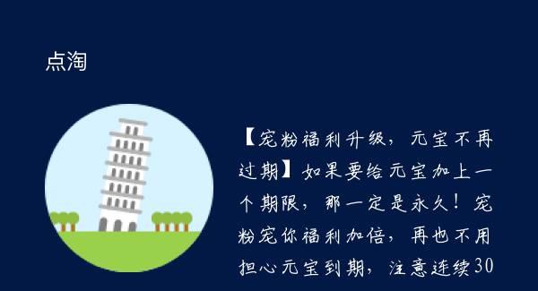 【宠粉福利升级,元宝不再过期】如果要给元宝加上一个期限,那一定是永久!宠粉宠你福利加倍,再也不用担心元宝到期,注意连续30天不登录点淘,元宝还是会离你而去哦,一定记得经常来看看