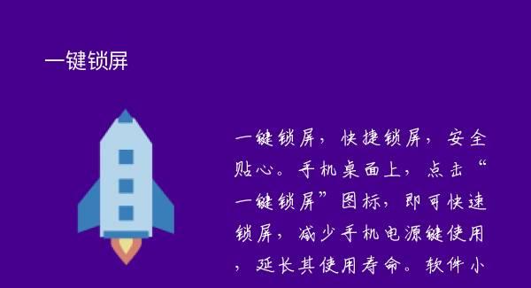 一键锁屏,快捷锁屏,安全贴心。手机桌面上,点击“一键锁屏”图标,即可快速锁屏,减少手机电源键使用,延长其使用寿命。软件小,绿色纯净无广告,是您装机必备的实用软件。由于部分手机厂