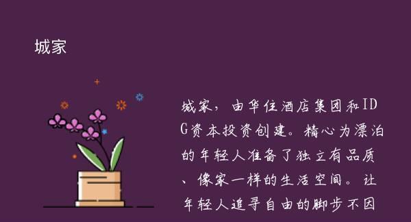 城家,由华住酒店集团和IDG资本投资创建。精心为漂泊的年轻人准备了独立有品质、像家一样的生活空间。让年轻人追寻自由的脚步不因高昂的房价而却步,不用为住而焦虑。城家布局全国,拥有