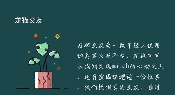 龙猫交友是一款年轻人使用的真实交友平台。在这里可以找到灵魂match的心动之人。还盲盒匹配邂逅一份惊喜。我们提倡真实交友,通过亲密度来解锁亲密功能,避免无效交流和人打扰。更多交