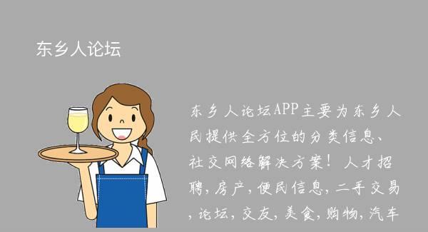 东乡人论坛APP主要为东乡人民提供全方位的分类信息、社交网络解决方案!人才招聘,房产,便民信息,二手交易,论坛,交友,美食,购物,汽车,旅游,新闻等综合门户网!东乡人自己的论坛